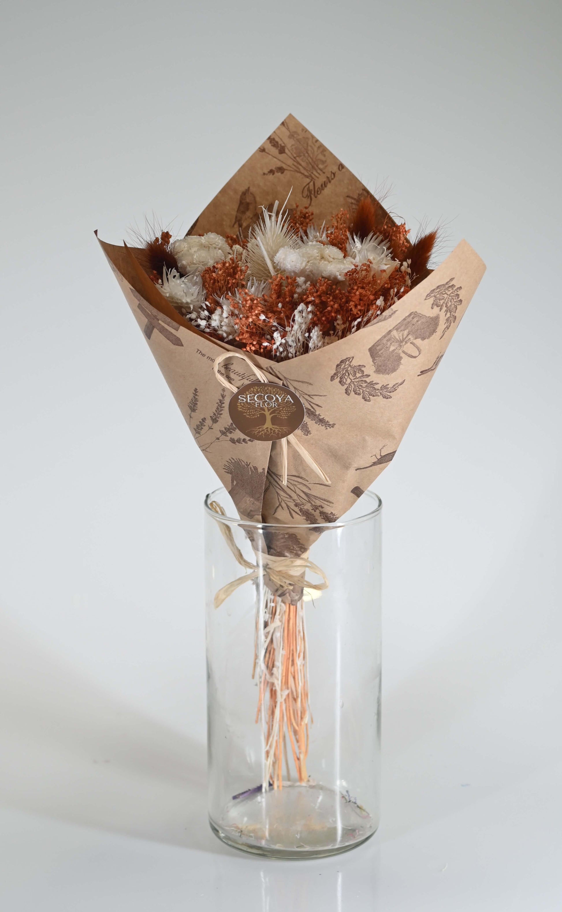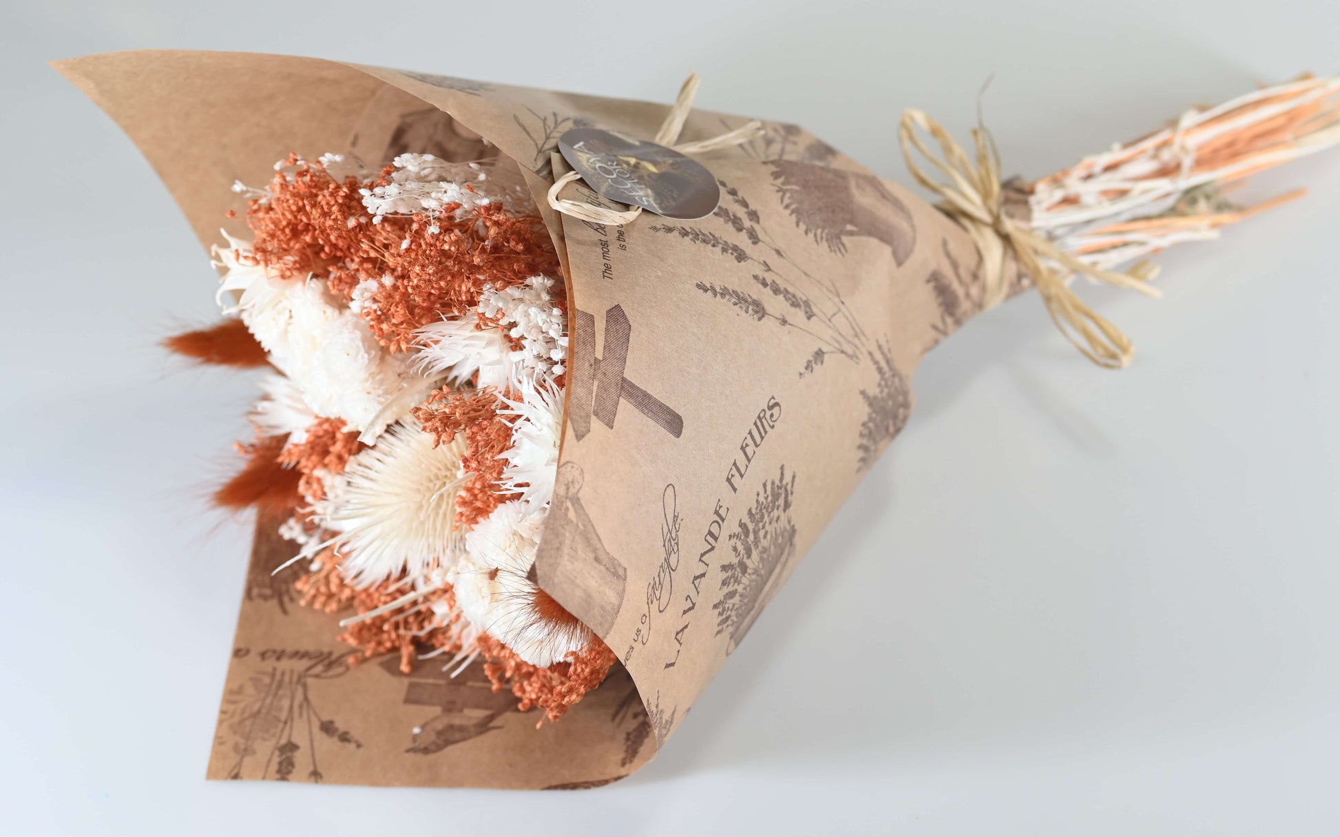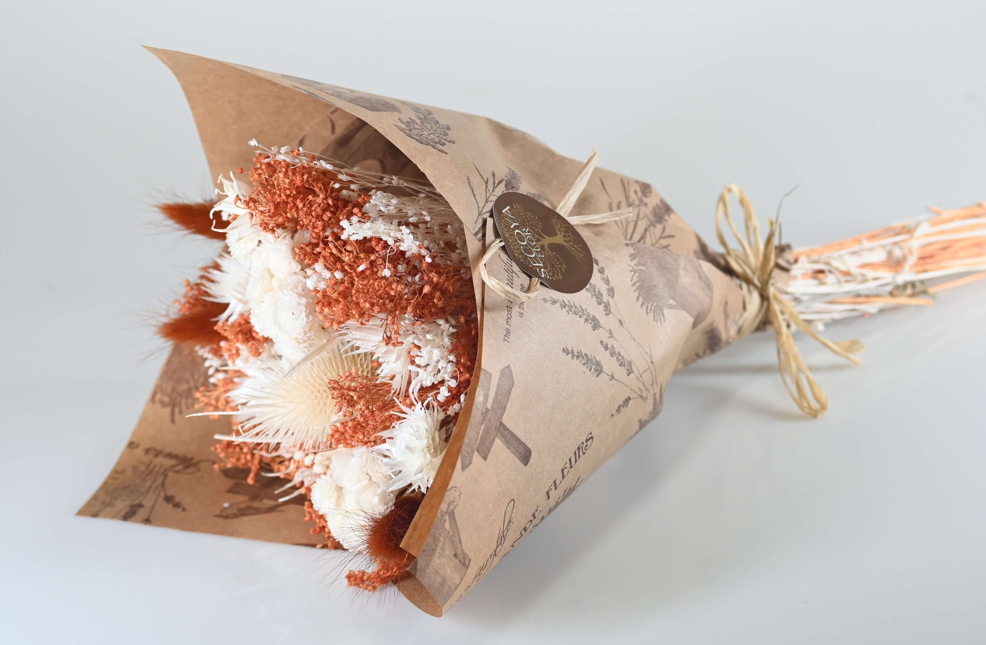 Lueur d’Automne dévoile une harmonie apaisante entre les tons ambrés et les blancs lumineux. Ce bouquet de fleurs séchées capture la chaleur des journées d’automne, où le vent caresse les champs et où la lumière s’adoucit.